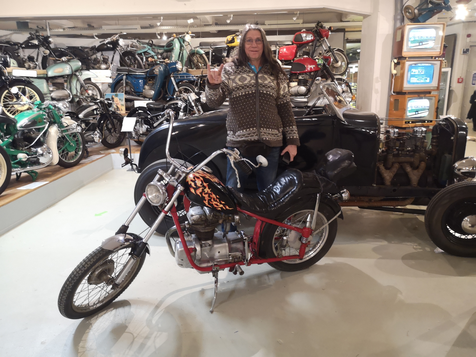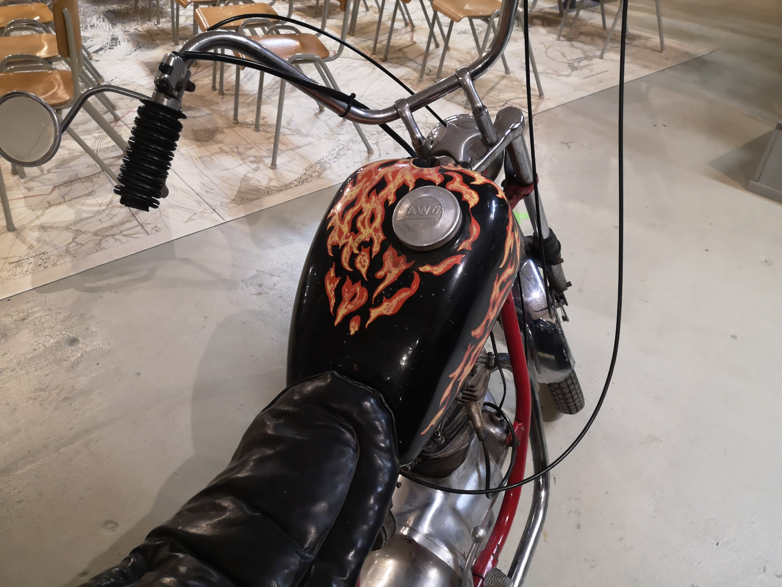 Aber da ist ja noch der Gerd. Er ist einer dieser Typen, die ihre eigene Vorstellung vom Leben haben; gern etwas freier und anders. Dazu gehörte es zu DDR-Zeiten, sich seine AWO immer und immer wieder umzubauen. Eine verlängerte Gabel, Flammen-(RT)-Tank plus Stufensitzbank und selbstgefertigte Chromteile mussten sein. Ein Hauch von American Dream kam auf, wenn in den 1980ern mit den Kumpels der erreichbare Osten unsicher gemacht wurde. Schnöde MZ-Fahrer konnten nur staunen.